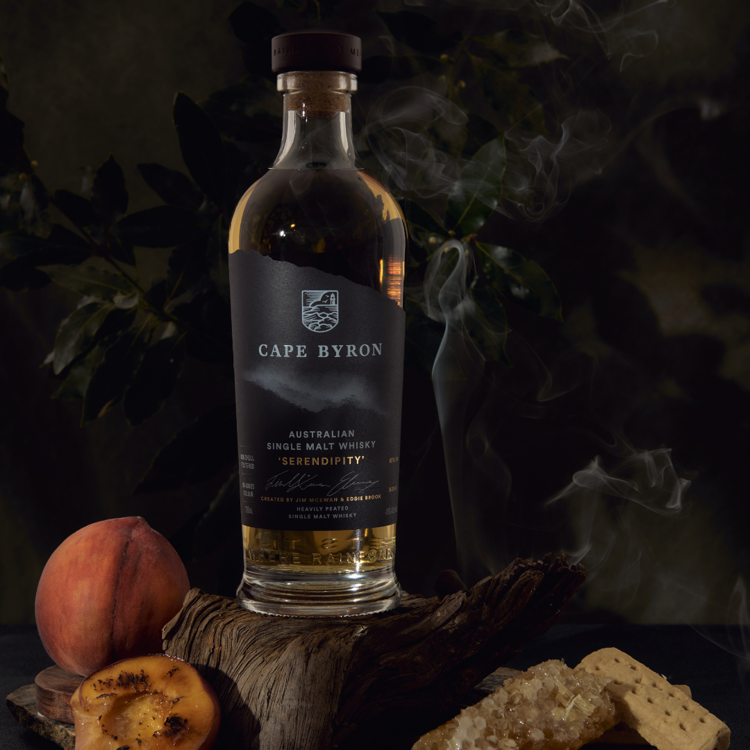 Cape Byron ‘Serendipity’ Peated Single Malt Whisky Batch 001, a unique expression, aged in American oak ex-bourbon casks.